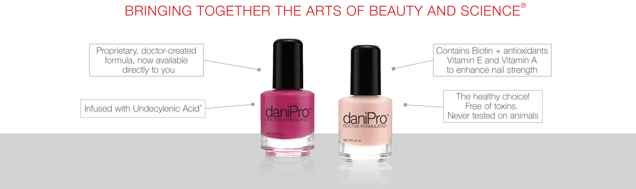 DaniPro is the only doctor-formulated nail polish infused with Undecylenic Acid* and free of damaging chemicals found in other popular brands. No Formaldehyde, DBP, or Toluene. Gives you vibrant, chip-resistant color that also fights nail fungus; Hides nail fungus so you can wear open-toe shoes while treating your toenails at the same time Antifungal Undecylenic Acid fights fungus for up to seven days Free from harmful chemicals found in other nail polishes, DaniPro is healthier for your nails Helps relieve: Nail Remedies, Thick & Yellow Toenails